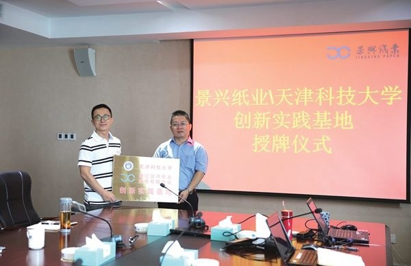 仪式上,刘洪斌向公司授予“创新实践基地”牌匾,同时聘用徐东、曹海兵、鲁宾、程正柏、徐清凉5 人为天津科技大学造纸学院企业导师并颁发聘书。