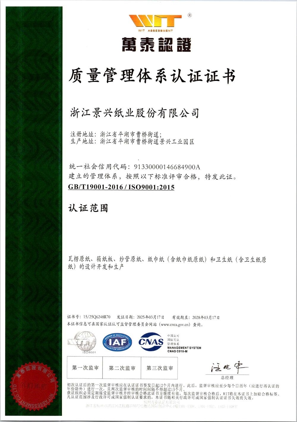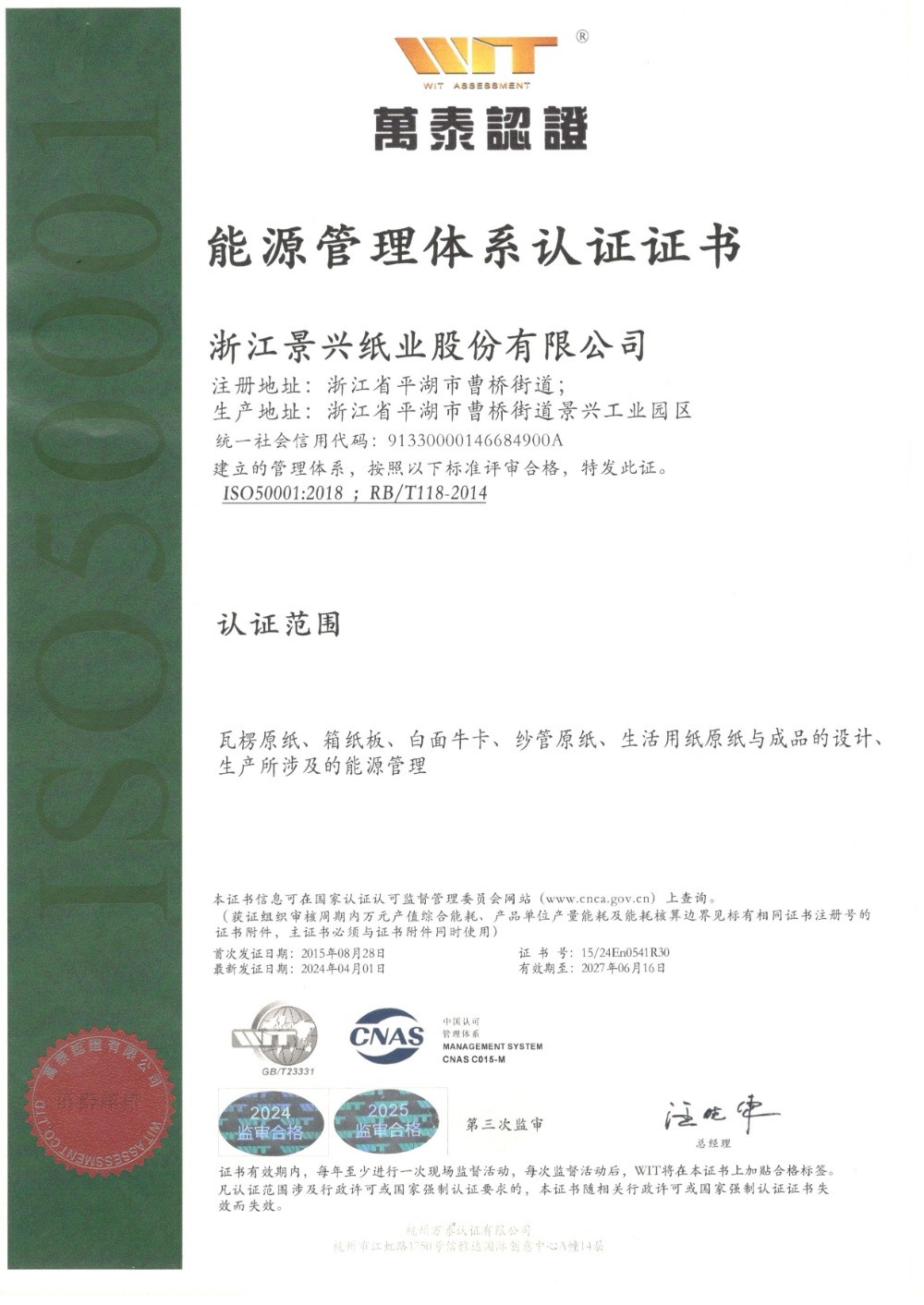 k1体育于1996年率先在同行业通过ISO9001质量管理体系认证,2002年通过ISO14001环境管理体系认证,2014年通过OHSAS18001职业健康安全管理体系认证,2015年通过GB/T23331能源管理体系和FSC®森林体系认证,2018年通过两化融合管理体系认证。
